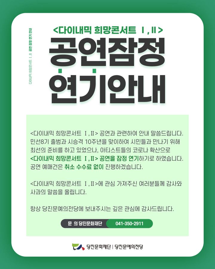 | 60 | 당진시순회연주회<다이내믹 희망콘서트Ⅰ-카르미나부라나>공연취소안내 | 충남교향악단 | 138 | 2022-07-21 | 294892979_7749536438421530_3924672843648858417_n.jpg |