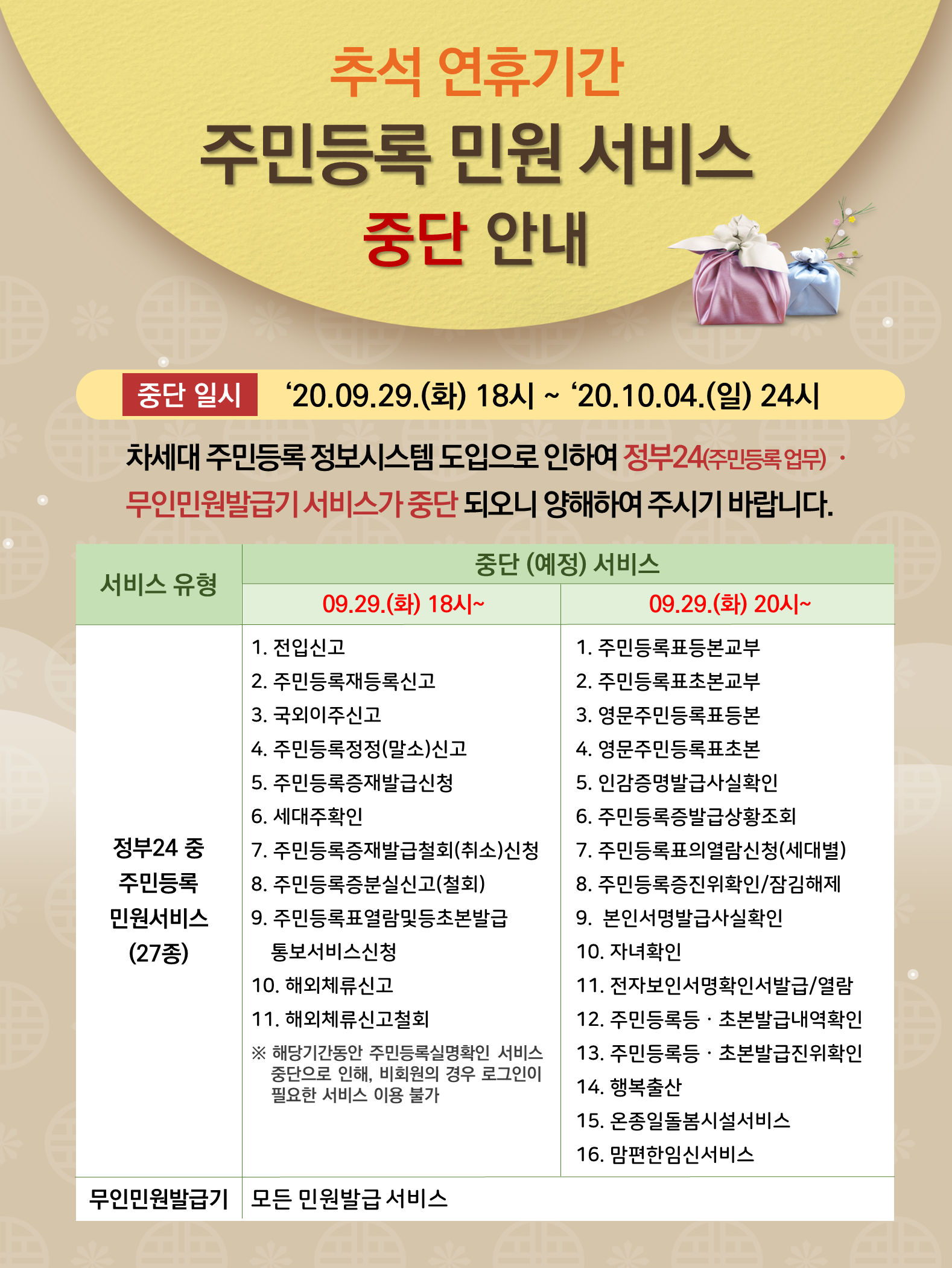 | 7450 | 추석 연휴기간 주민등록 민원 서비스 중단안내 | 유구읍 | 60 | 2020-09-21 | 주민등록민원서비스 중단안내_시간변경.png |