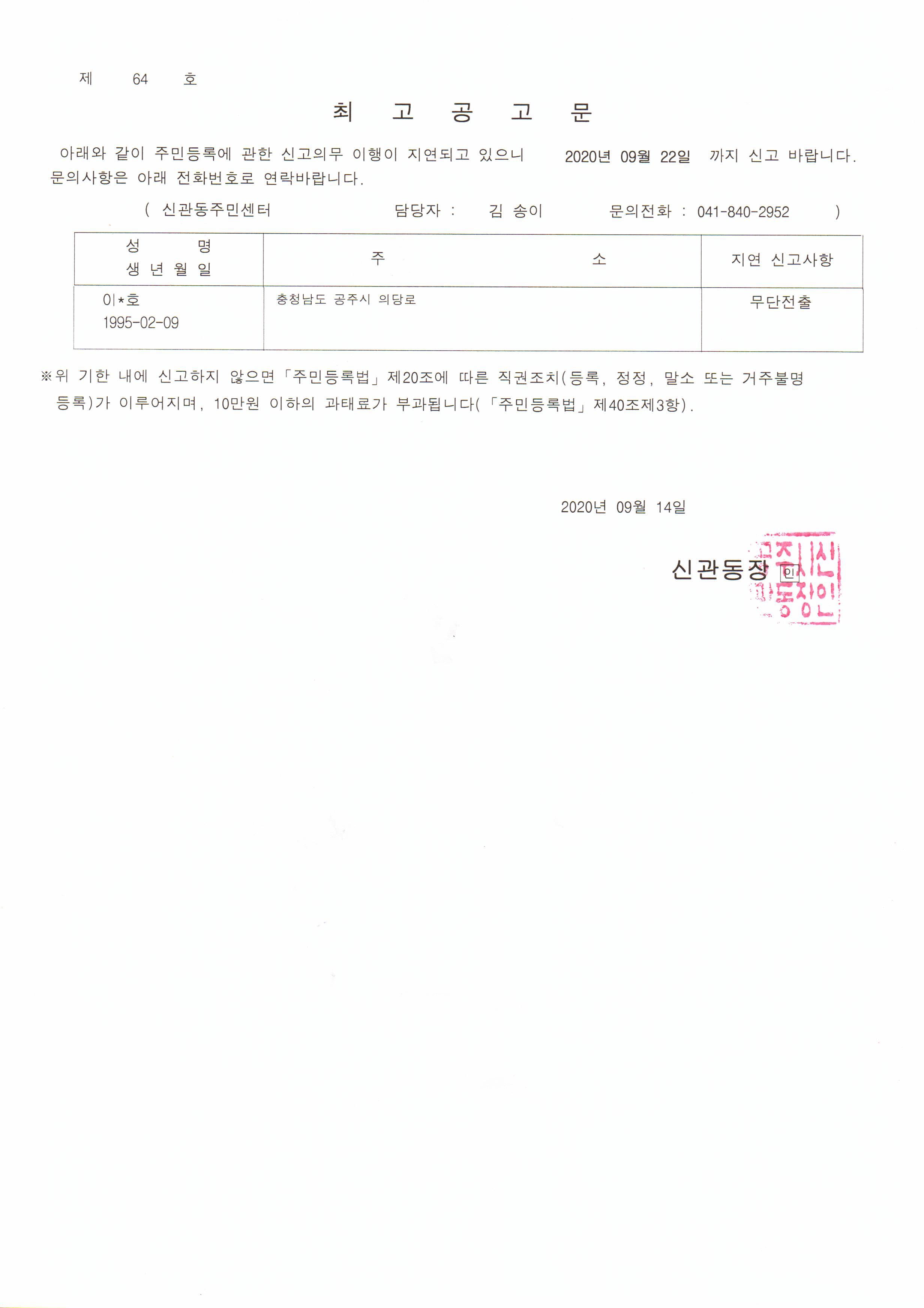 | 7436 | 주민등록 거주불명 최고공고 | 신관동 | 48 | 2020-09-14 | 공고제64호.jpg |