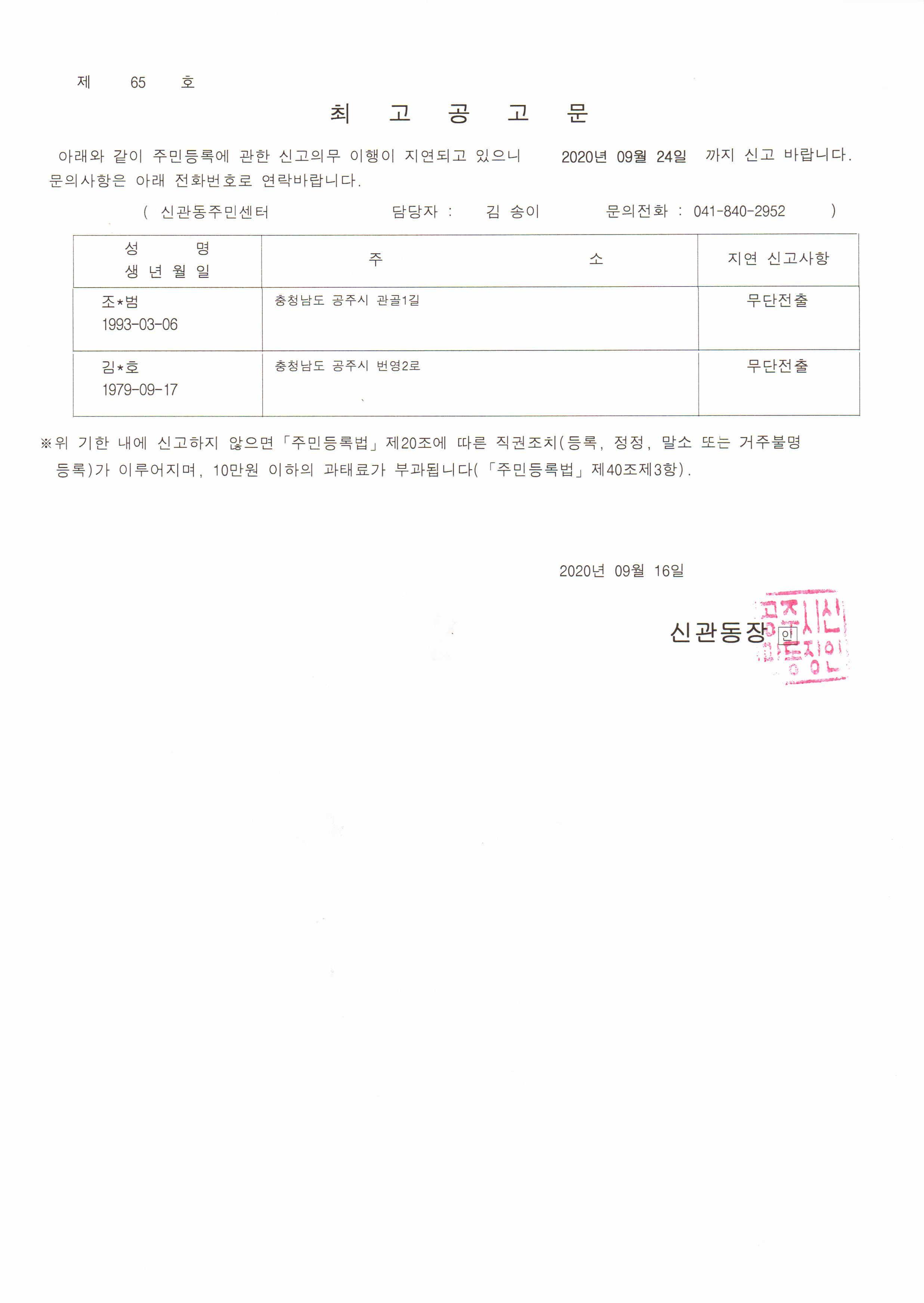 | 7441 | 주민등록 무단전출에 따른 최고공고 | 웅진동 | 30 | 2020-09-16 | 최고공고문(배OO).pdf |