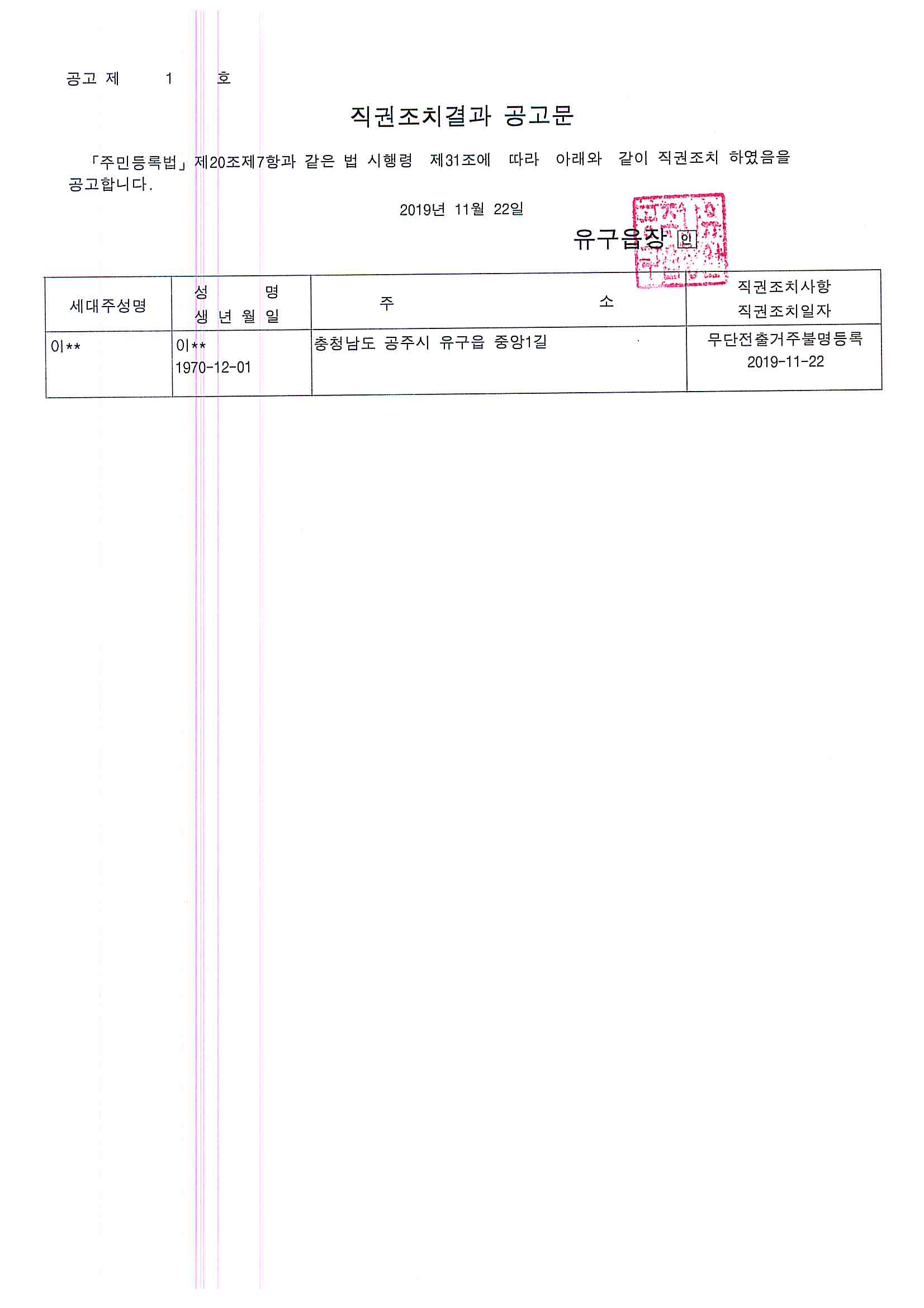 | 6753 | 주민등록 거주불명등록 직권조치 결과공고 | 유구읍 | 131 | 2019-11-25 | 직권조치결과공고문.jpg |