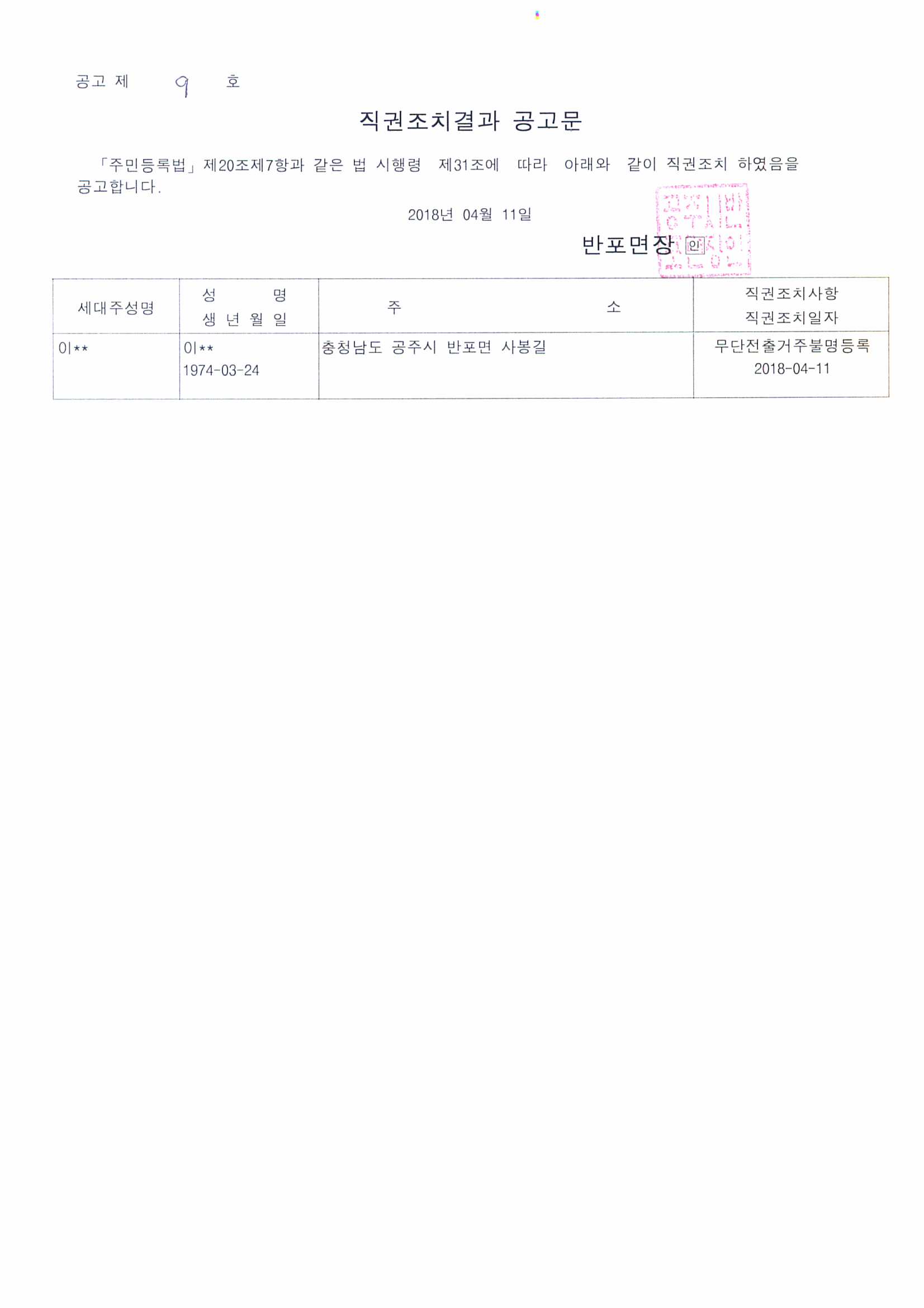 | 4910 | 무단전출자 직권조치결과 공고 | 반포면 | 216 | 2018-04-12 | 직권조치결과 공고문.jpg |