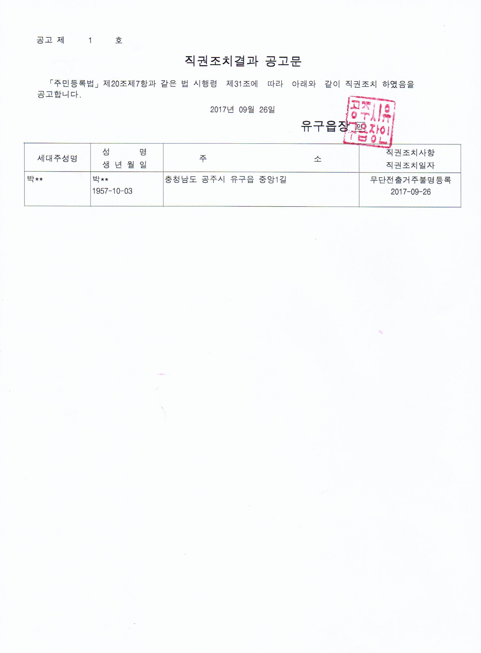 | 4383 | 주민등록 사실조사에 따른 무단전출자 최고공고 | 유구읍 | 387 | 2017-09-26 | 직권조치결과공고문.jpg |