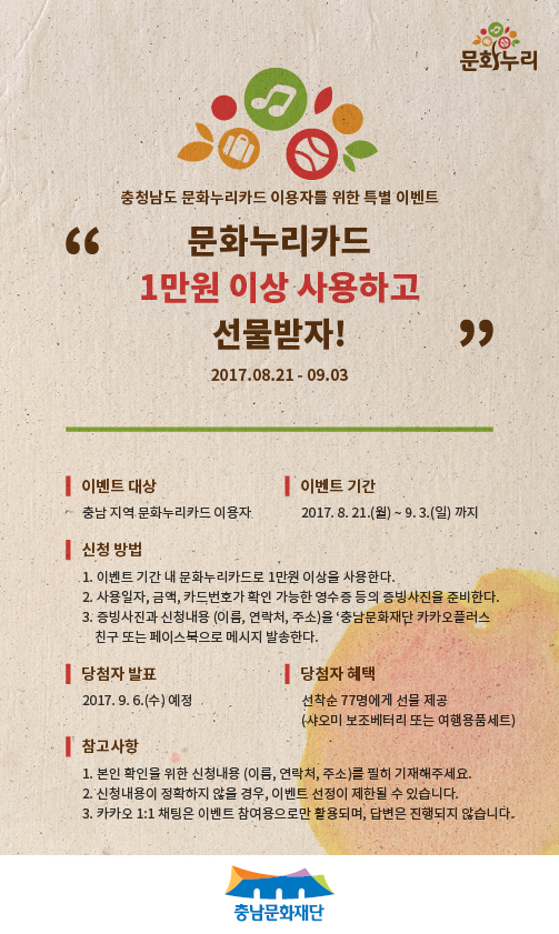 | 4311 | 2017년 통합문화이용권사업 "사용인증 이벤트" 안내 | 탄천면 | 158 | 2017-08-24 | 문화누리카드 사용인증 이벤트 홍보물.jpg |