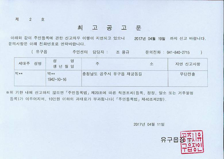 | 4031 | 주민등록 무단전출자 최고공고 | 유구읍 | 469 | 2017-04-11 | 최고공고문.jpg |