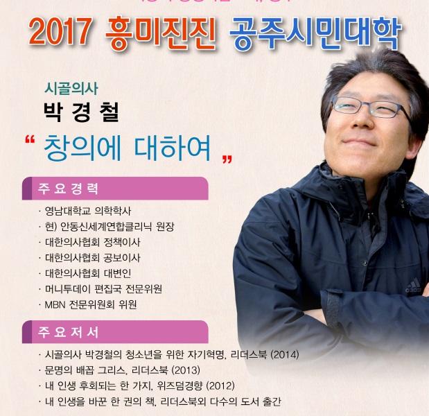 | 3993 | 2017 흥미진진, 공주시민대학 제31강 안내("창의에 대하여" 박경철 강사님) | 탄천면 | 445 | 2017-03-30 | 홍보문.jpg |