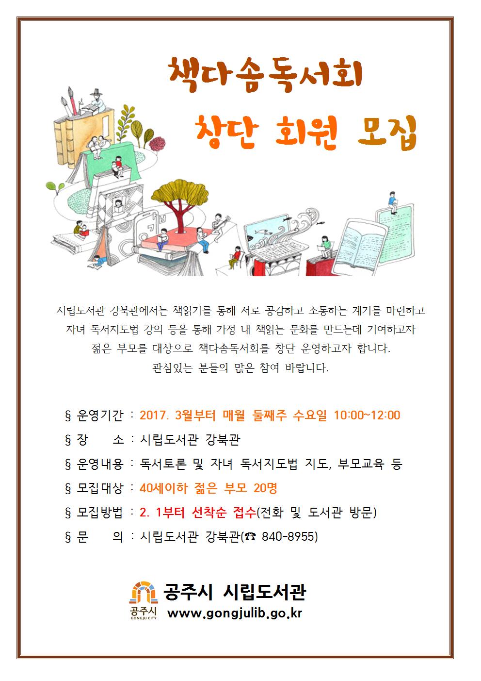 | 3810 | 시립도서관 책다솜독서회 창단 회원모집 | 탄천면 | 374 | 2017-02-01 | 홍보문.jpg |