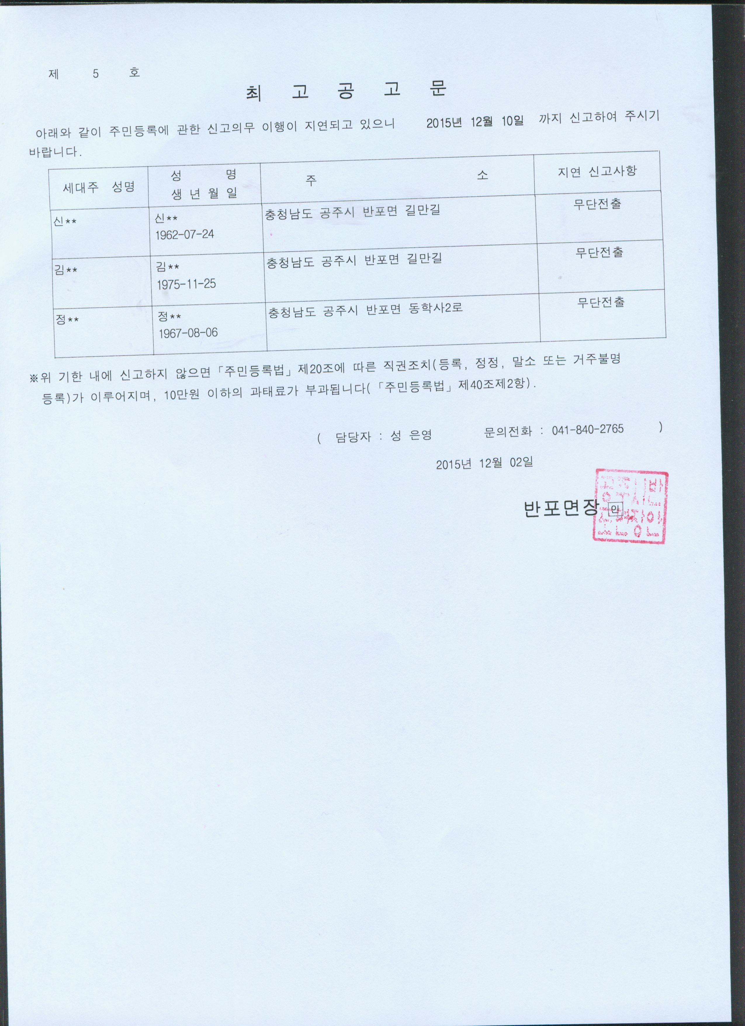 | 2798 | 주민등록 거주불명등록 최고공고 | 반포면 | 956 | 2015-12-02 | 2015년 4분기 주민등록실태조사 최고공고문.jpg |