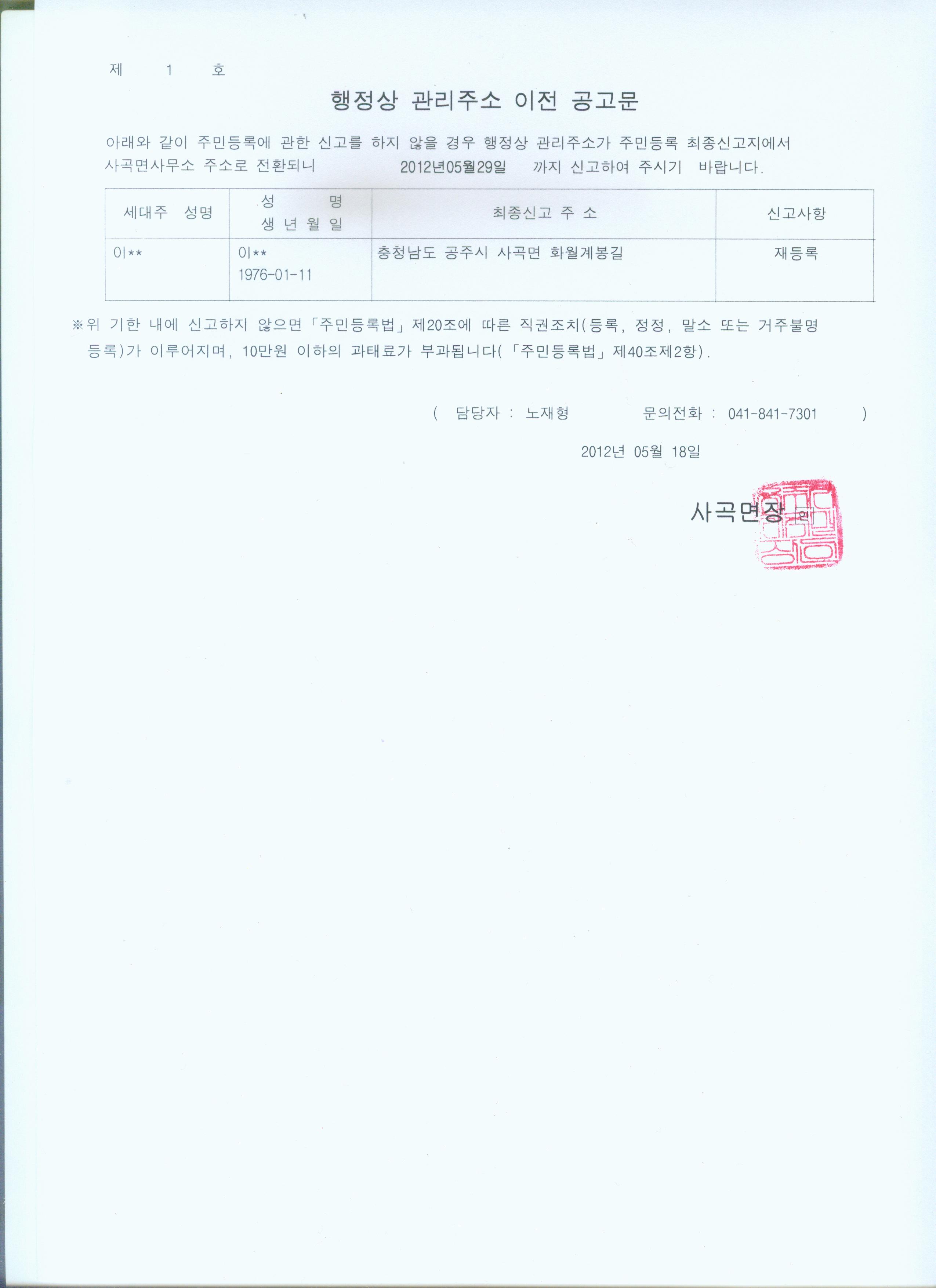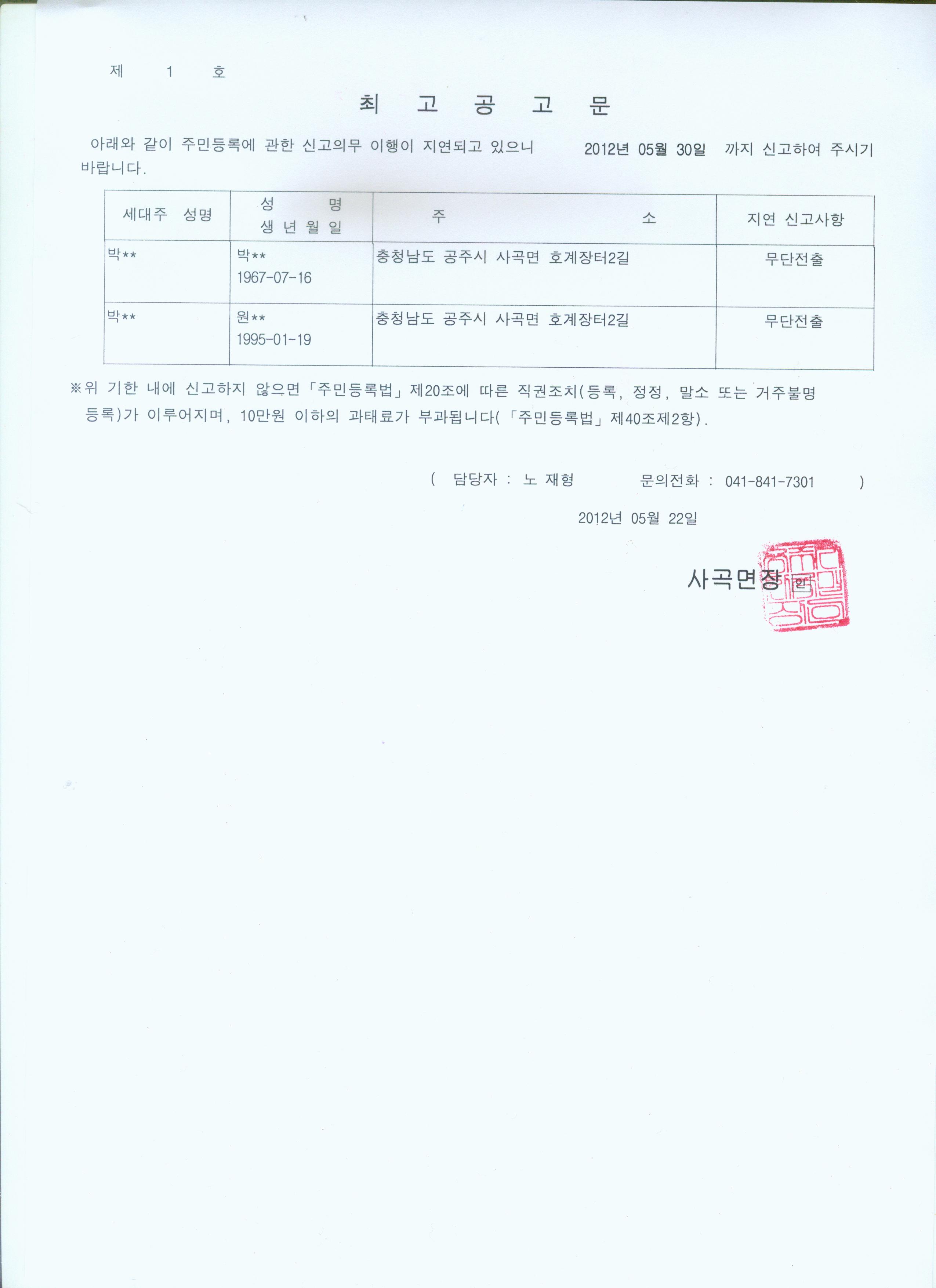 | 1348 | 주민등록 신고사항 상이자 공고 | 관리자 | 808 | 2012-05-23 | 최고공고문.jpg |