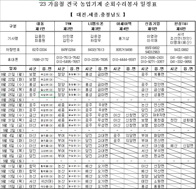 | 11768 | 2023년 가을철 전국 농업기계 순회수리봉사 일정 알림 | 의당면 | 42 | 2023-08-28 | 가을철 농업기계 순회수리봉사 일정.JPG |
