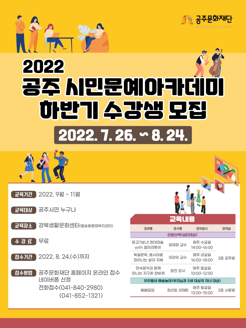 | 9584 | 2022 공주시민문예아카데미 하반기 수강생 모집 안내 | 계룡면 | 67 | 2022-08-19 | 문예아카데미 웹포스터.jpg |