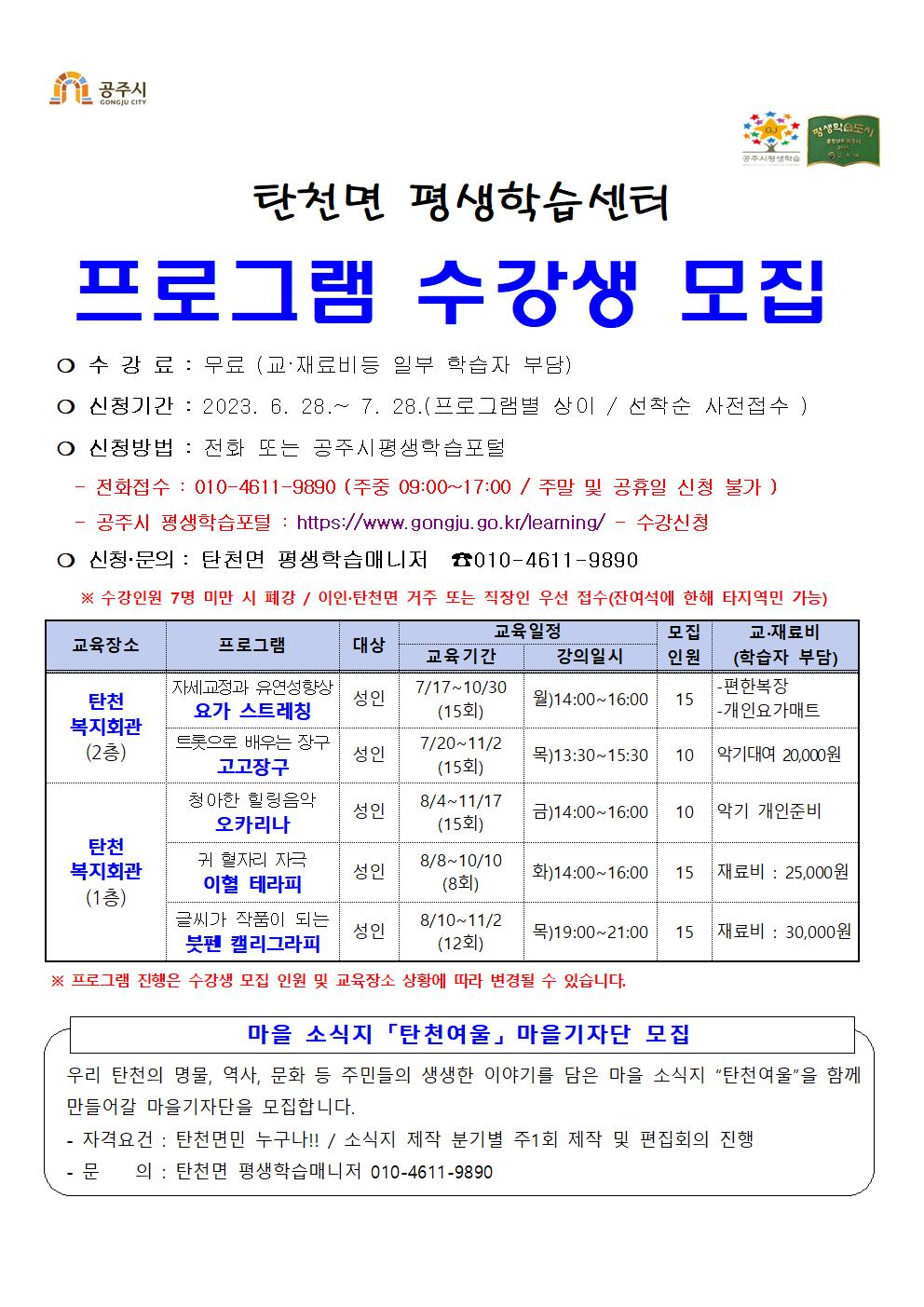 | 302 | 2023년 하반기 탄천면 평생학습센터 수강생 모집 | 평생교육과 | 817 | 2023-06-28 | 23하반기-탄천면 학습자 모집 홍보물.jpg |
