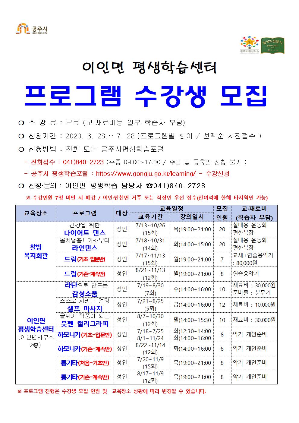 | 303 | 2023년 하반기 이인면 평생학습센터 수강생 모집 | 평생교육과 | 1,285 | 2023-06-28 | 23하반기-이인면 학습자 모집 홍보물.jpg |