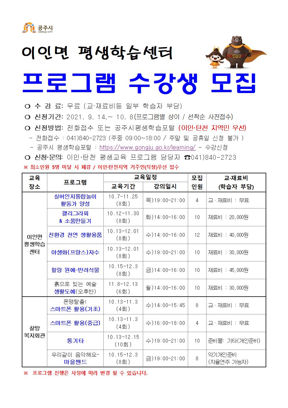 | 220 | 2021년 하반기 이인면평생학습센터 프로그램 수강생 모집 | 평생교육과 | 809 | 2021-09-13 | (하반기)이인탄천 평생학습센터 수강생 모집 홍보물001.jpg |